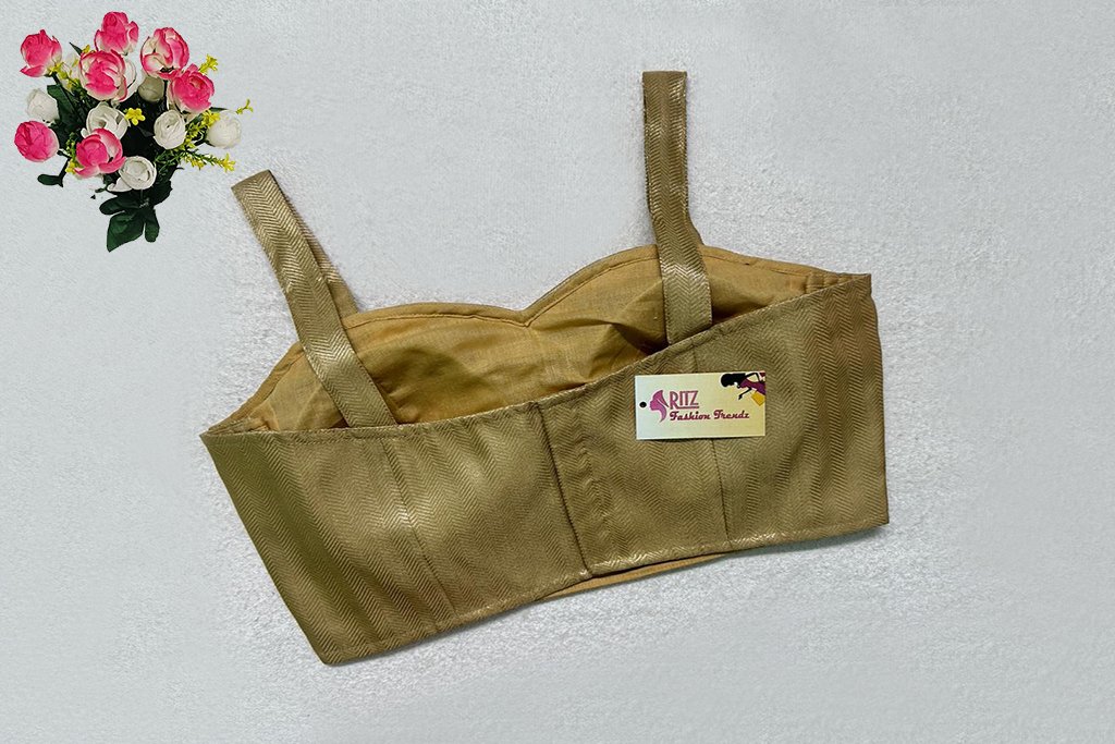 This is a Golden Color Brocade Spaghetti. This is a Sweetheart Neckline Blouse in Frontside & Band Neckline in Backside. This is a Princess Cut, Padded, Sleeveless Blouse with Back Open. You can team it up with any contrast-colored Traditional/Printed Saree.