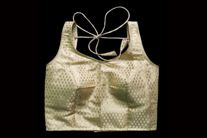This is a Golden Color Brocade Blouse. This Blouse is Semi-Sweetheart Neckline in Frontside and Leaf  Neckline in Backside with Tie-Up. This is a Princess Cut, Padded, Sleeveless Blouse with Back Open. You can team it up with any contrast colored Printed or Traditional Saree.