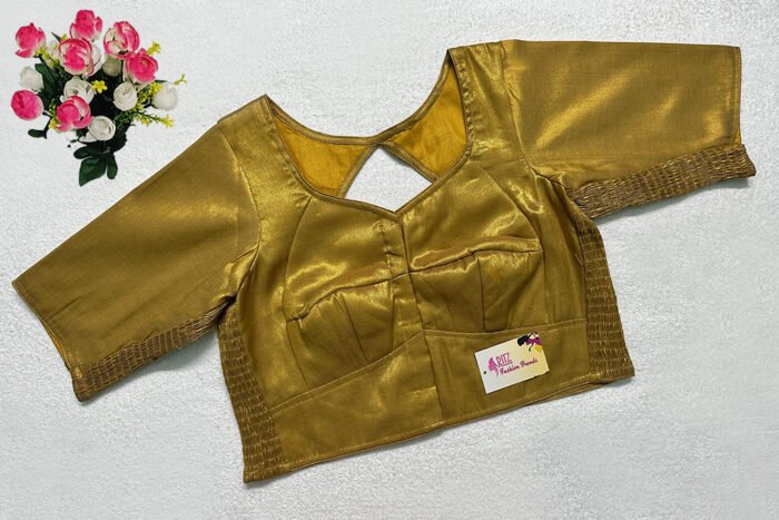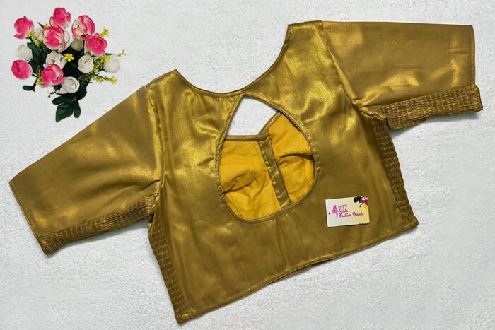 This is a Golden Color Brocade Elastic Ease Blouse. This is Leaf Neckline in Frontside & Key-Hole Neckline in Backside. This is a Choli-Cut, Non-Padded, Glass Sleeve (Used Sponge) Blouse with Front Open. You can team it up with any contrast-colored Traditional/Printed Saree.