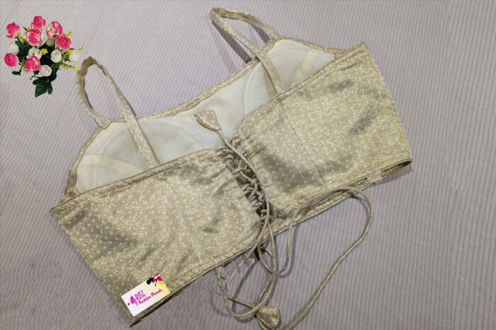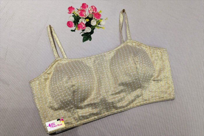 This is a White Golden Color Brocade Spaghetti. It is Round Neckline in Frontside and Band Neckline in Backside with Tie-Up. This is a Princess Cut, Padded, Spaghetti Blouse with Back Open. You can team it up with any contrast colored Printed/Traditional Saree.