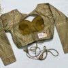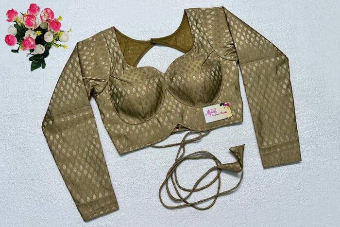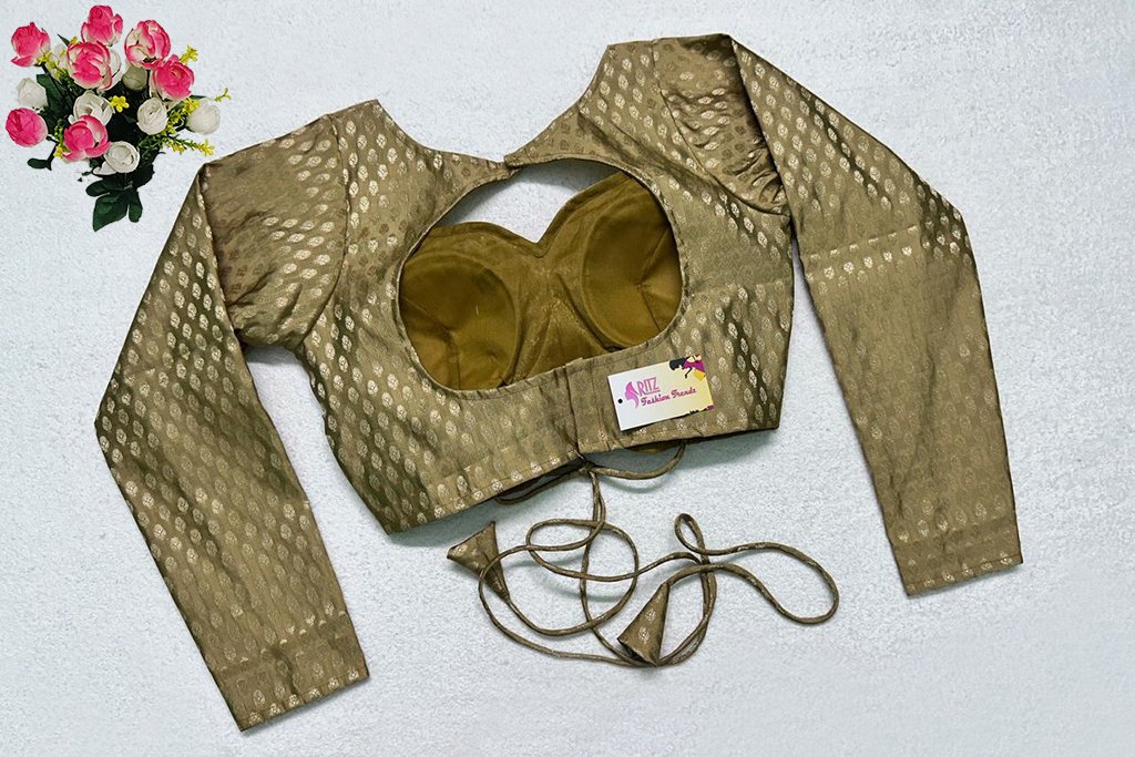 This is a Golden Color Brocade Blouse. This is Sweetheart Neckline in Frontside & Key-Hole Neckline in Backside with Tie-Up. This is a Princess Cut, Padded, Full Sleeve Blouse with Back Open. You can team it up with any contrast-colored Traditional/Printed Saree.