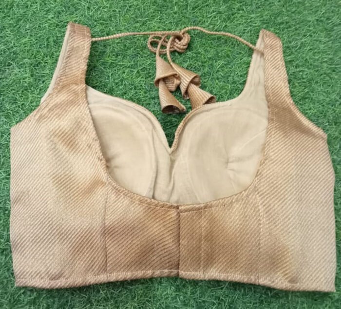 This is a Golden Color Brocade Sleeveless Blouse. It has Sweet Heart Neckline in Frontside and Rounded Neckline in Backside with Tie Up. This is a Princess Cut Padded Blouse with Back Open. You can team it up with any contrast colored Traditional Saree.