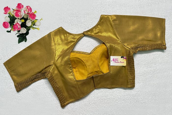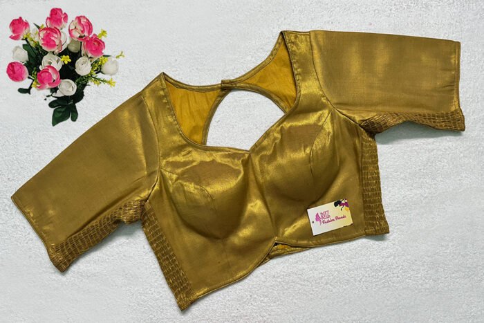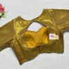 This is a Golden Color Brocade Elastic Ease Blouse. This is Leaf Neckline in Frontside & Key-Hole Neckline in Backside. This is a Princess Cut, Padded, Glass Sleeve Blouse with Back Open. You can team it up with any contrast-colored Traditional/Printed Saree.