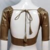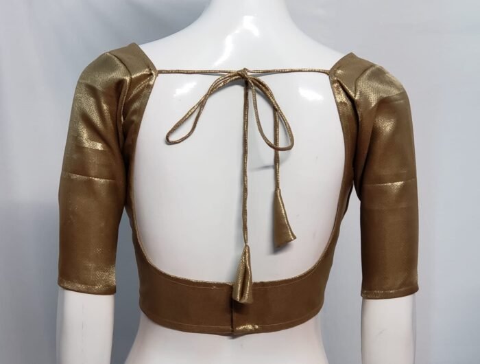 This is an Antique Golden Color Brocade Blouse. This Blouse is Sweet Heart Neckline in Frontside and U-Neckline in Backside with Tie-Up. This is a Princess Cut, Padded & Glass Sleeve Blouse with Back Open. You can team it up with any contrast colored Printed or Traditional Saree.