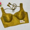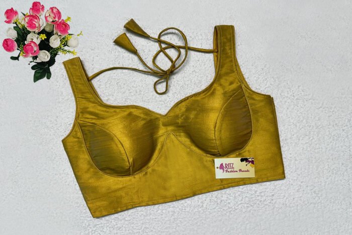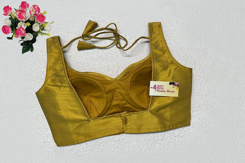 This is a Golden Color Raw Silk Blouse. This is Sweetheart Neckline in Frontside & Square Neckline in Backside with Tie-Up. This is a Princess Cut, Padded, Sleeveless Blouse with Back Open. You can team it up with any contrast-colored Traditional/Printed Saree.