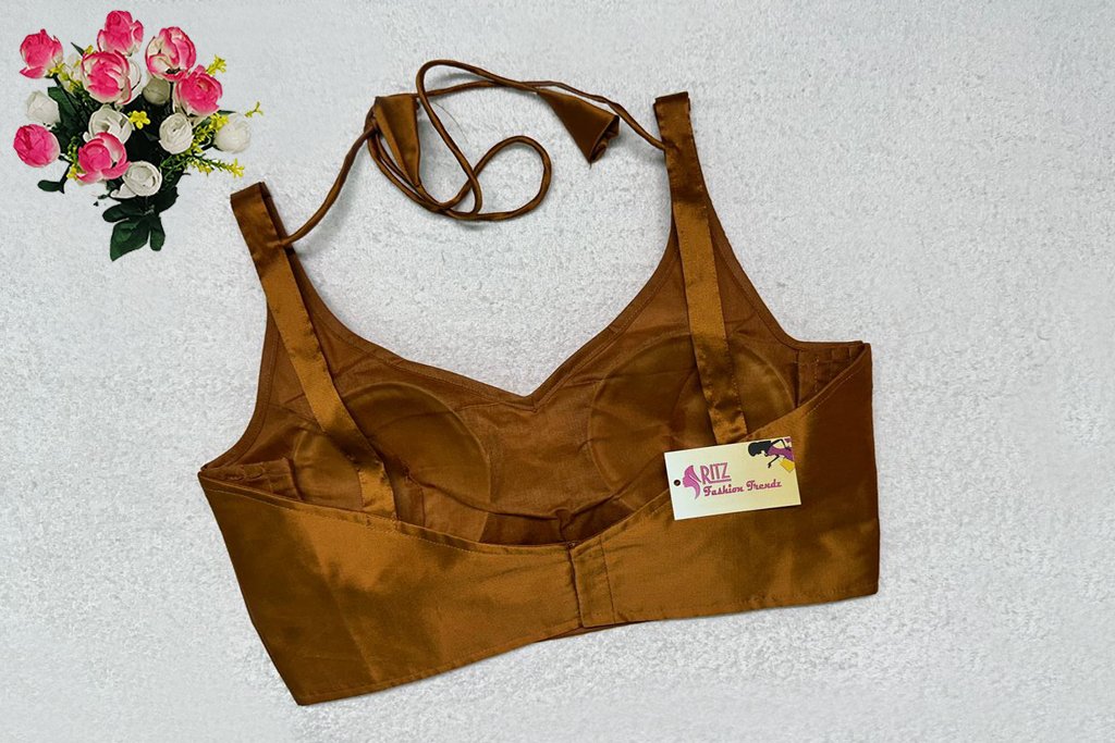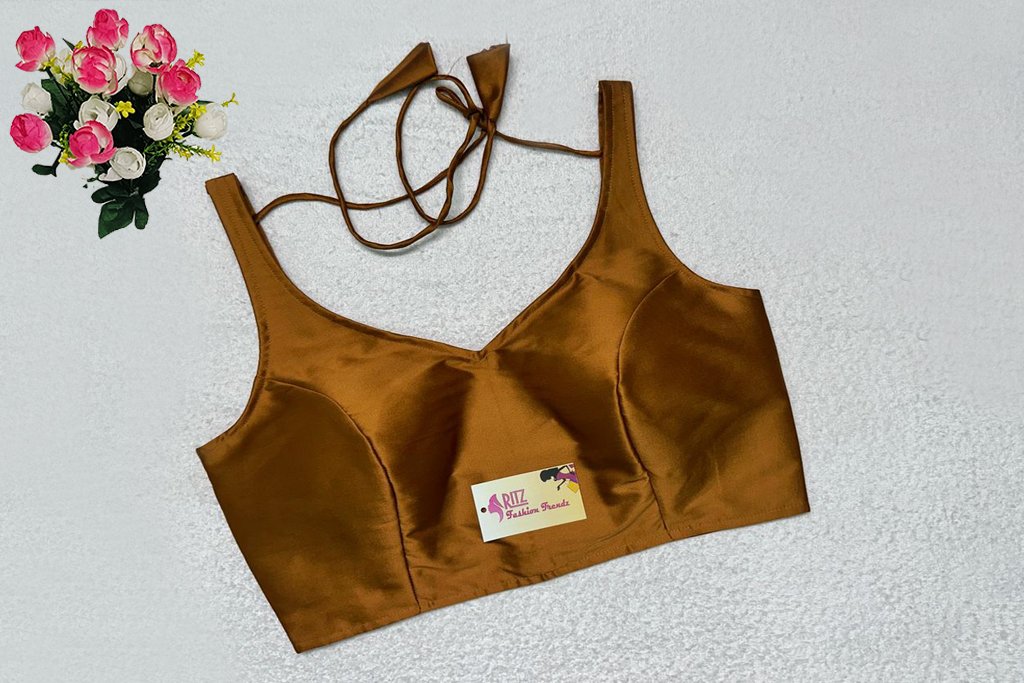 This is a Mustard Color Samo Silk Blouse. This is Leaf Neckline in Frontside & U-Neckline in Backside with Tie-Up. This is a Princess Cut, Padded, Sleeveless Blouse with Back Open. You can team it up with any contrast-colored Traditional/Printed Saree.