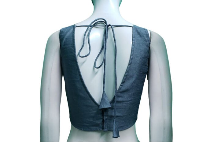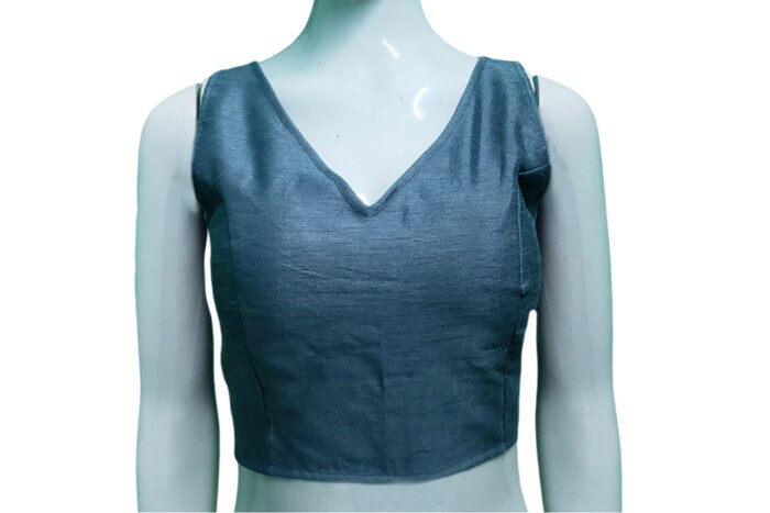This is a Bluish Gray Color Raw Silk Blouse. This Blouse is V-Neckline in both Frontside and Backside with Tie-Up. This is a Princess Cut, Padded, Sleeveless Blouse with Back Open. You can team it up with any contrast colored Printed or Traditional Saree.