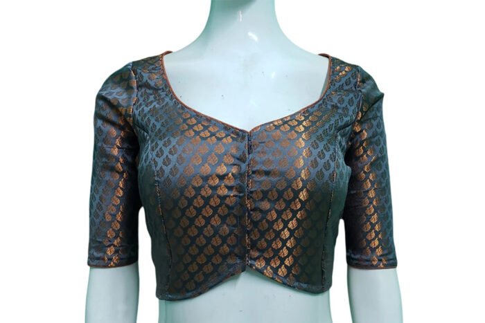 This is a Dark Gray Color Brocade Blouse. This Blouse is Semi-Sweetheart Neckline in Frontside and Boat Neckline in Backside. This is a Princess Cut, Padded, Glass Sleeve Blouse with Front Open. You can team it up with any contrast colored Printed or Traditional Saree.