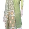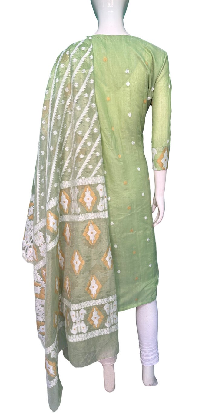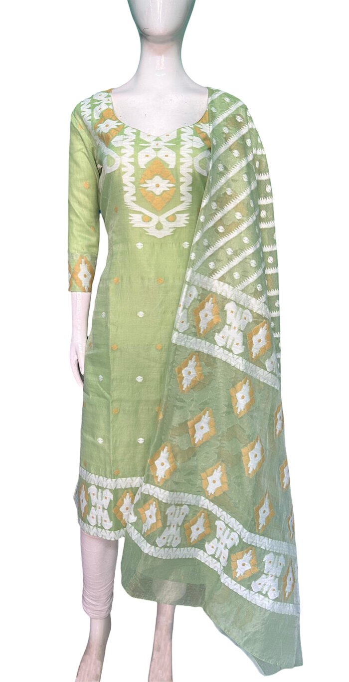 This is a Green Color Jamdani Kurti Set. It is Leaf Neckline in Frontside & High Neckline in Backside. This Kurti is 3/4 Sleeve and Knee Length.
