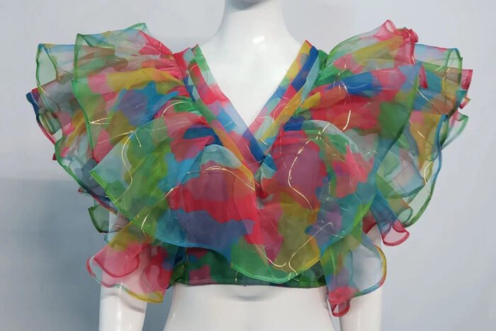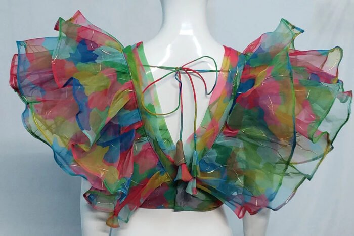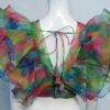 This is a Green Multi Color Organza Blouse. This Blouse is V-Neckline in Frontside and Deep V-Neckline in Backside with Tie Up. This is a Princess Cut Padded Blouse with Back Open & Ruffle Sleeve. You can team it up with any contrast colored Printed or Traditional Saree.