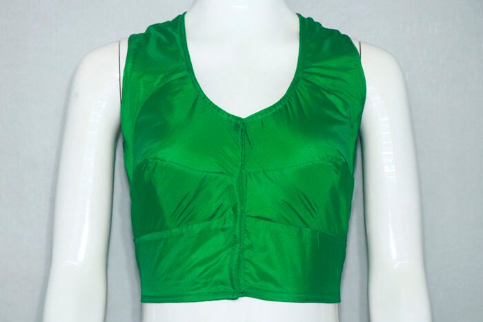 This is a Green Color Samo Silk Blouse. This Blouse is U-Neckline in Frontside and Backside with Tie Up. This is a Choli Cut Non-Padded Blouse with Sponge. This is a Sleeveless and Front Open Blouse. You can team it up with any contrast color Printed or Traditional Saree.