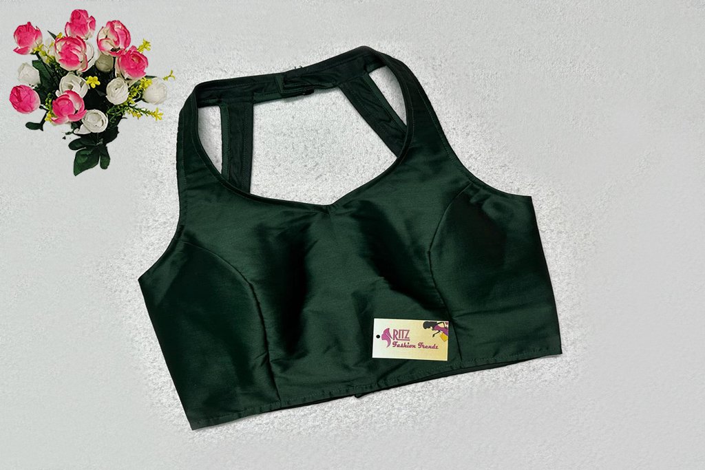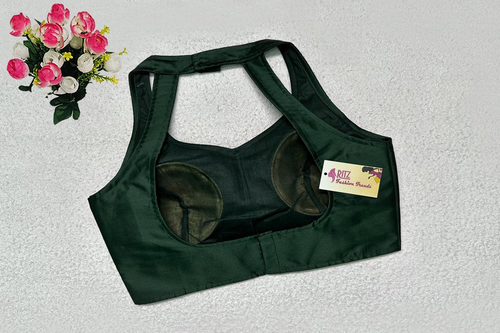 This is a Bottle Green Color Samo Silk Blouse. This is a Double Strap Halter Neckline Blouse in both Frontside & Backside. This is a Princess Cut, Padded, Sleeveless Blouse with Back Open. You can team it up with any contrast-colored Traditional/Printed Saree.