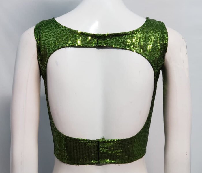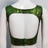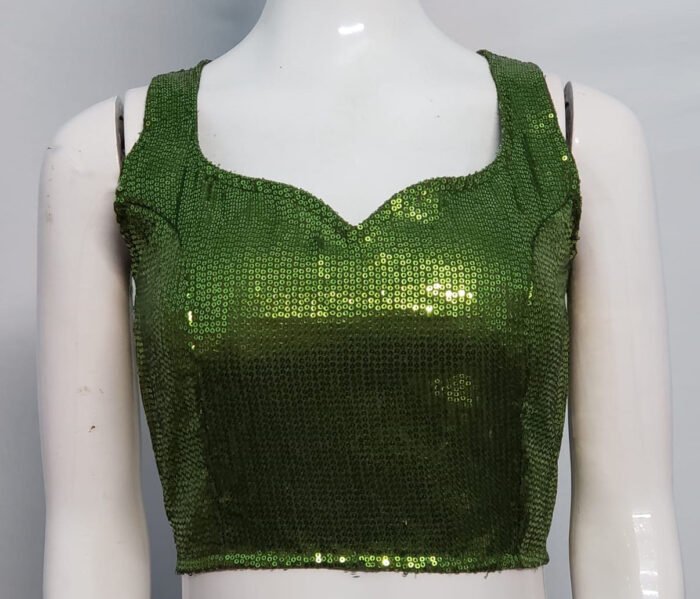 This is an Olive Green Color Sequin Blouse. This Blouse is Sweetheart Neckline in Frontside and Key-Hole Neckline in Backside. This is a Princess Cut, Padded & Sleeveless Blouse with Back Open. You can team it up with any contrast colored Printed or Traditional Saree.