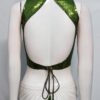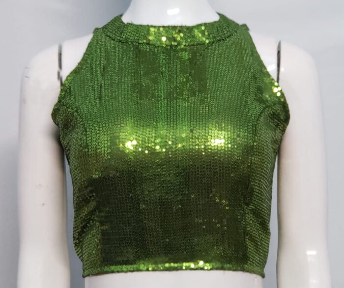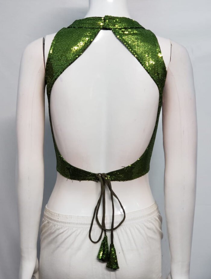 This is a Olive Green Color Sequin Blouse. This Blouse is Halter Neckline in Frontside and Backside with Tie Up. This is a Princess Cut, Padded & Sleeveless Blouse with Back Open. You can team it up with any contrast colored Printed or Traditional Saree.