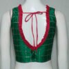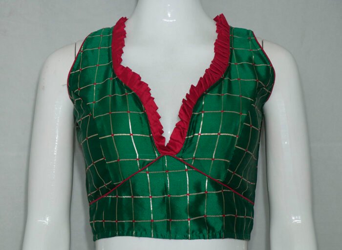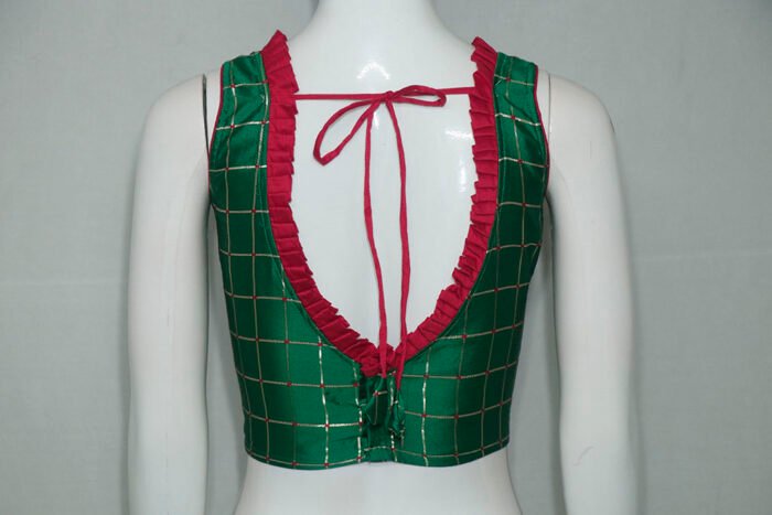 This is an Emerald Green Color Taffeta Silk Blouse with Pleated Work in both Necklines. This Blouse is Sweet Heart Neckline in Frontside and V-Neckline in Backside with Tie-Up. This is a Princess Cut Sleeveless Padded Blouse with Back Open. You can team it up with any contrast colored Traditional Saree.
