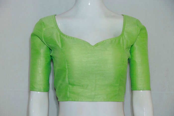 This is a Green Color Raw Silk Blouse. It is Sweetheart Neckline in Frontside and U-Neckline in Round Keyhole Neckline in Backside with Tie Up. This is a Princess Cut Padded Blouse. This Blouse is Glass Sleeve and Back Open. You can team it up with any contrast colored Printed or Traditional Saree.