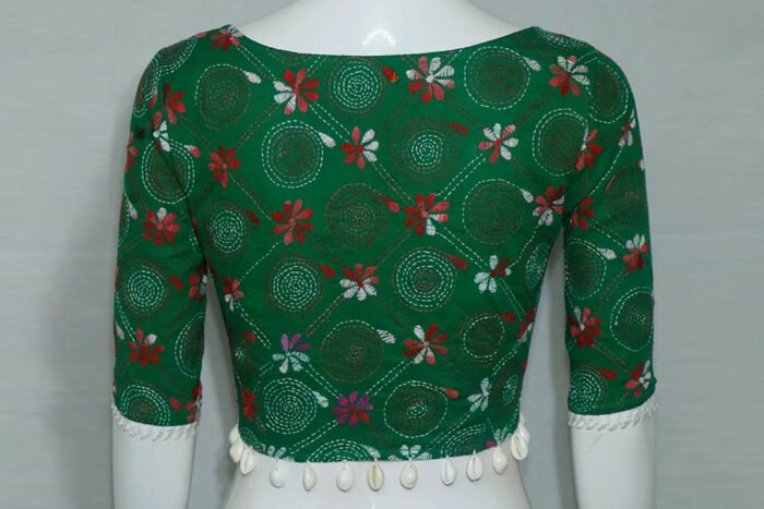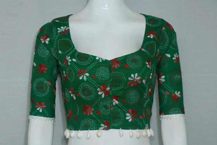 This is a Green Multi Color Cotton Kantha Stitch Blouse. This Blouse is Semi-Sweet Heart Neckline in Frontside and Boat Neckline in Backside with Kari and Lace. This is a Princess Cut Glass Sleeve Non-Padded Blouse with Front Open. You can team it up with any contrast colored Traditional/Printed Saree.