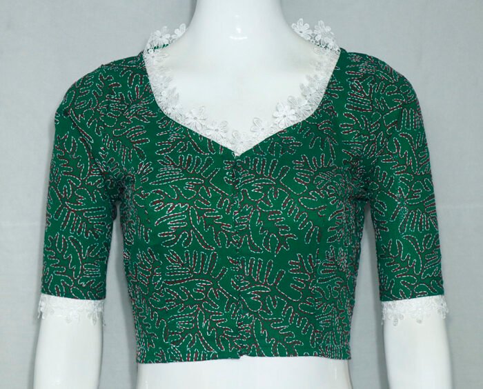 This is an Emerald Green Color Cotton Kantha Stich Blouse. This Blouse is Sweetheart Neckline in Frontside and High Neckline in Backside. This Blouse is Lace Embroidered in Sleeves and Necklines. This is a Princess Cut Glass Sleeve Non Padded Blouse with Front Open. You can team it up with any contrast colored Traditional Saree.