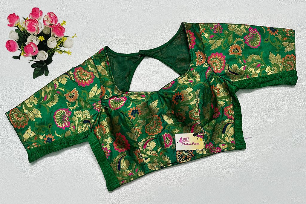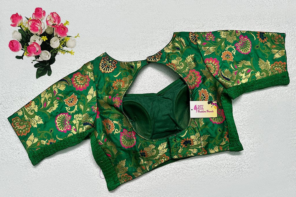 This is an Emerald Green Color Meena Kari Brocade Elastic Ease Blouse. This is Sweetheart Neckline in Frontside & Keyhole Neckline in Backside. This is a Princess Cut, Padded, Glass Sleeve Blouse with Back Open. You can team it up with any contrast-colored Traditional/Printed Saree.