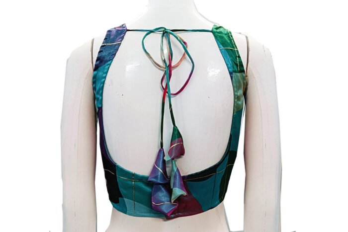 This is a Green Multi Color Printed Organza Blouse. This Blouse is Rounded Square Neckline in Frontside and U-Neckline in Backside with Tie-Up. This is a Princess Cut, Padded, Sleeveless Blouse with Back Open. You can team it up with any contrast colored Printed or Traditional Saree.