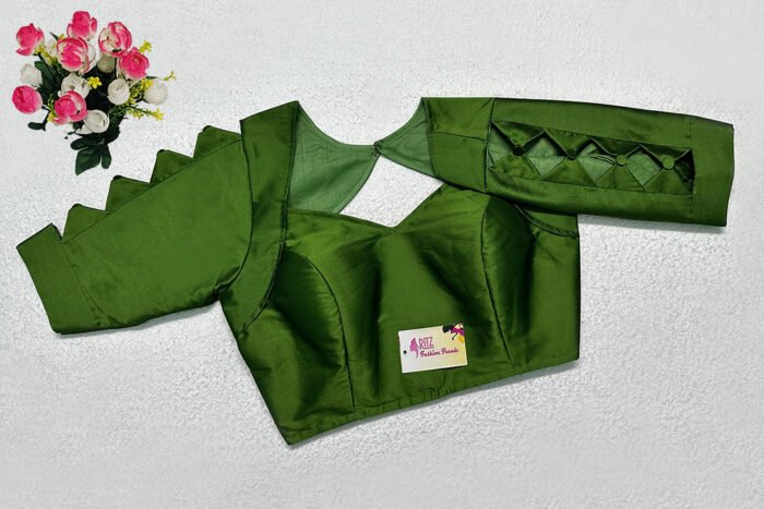 This is an Olive Green Color Samo Silk Blouse. This is Semi-Sweetheart Neckline in Frontside & Keyhole Neckline in Backside. This is a Princess Cut, Padded, Glass Sleeve Blouse with Back Open. You can team it up with any contrast-colored Traditional/Printed Saree.