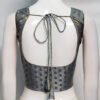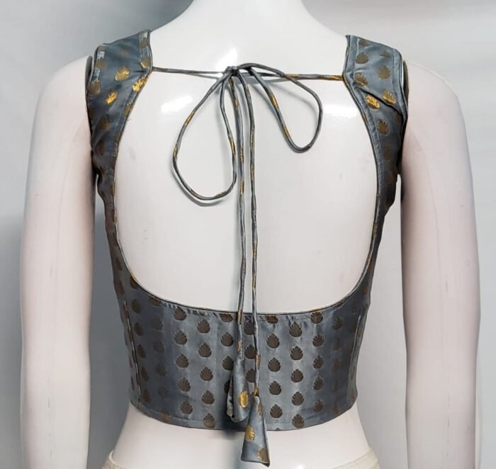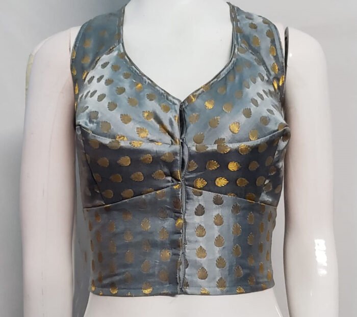 This is a Steel Gray Color Satin Benarasi Blouse. This Blouse is Leaf Neckline in Frontside and U-Neckline in Backside with Tie-Up. This is a Choli-Cut, Non-Padded, (Used Sponge) Sleeveless Blouse with Front open. You can team it up with any contrast colored Printed or Traditional Saree.