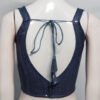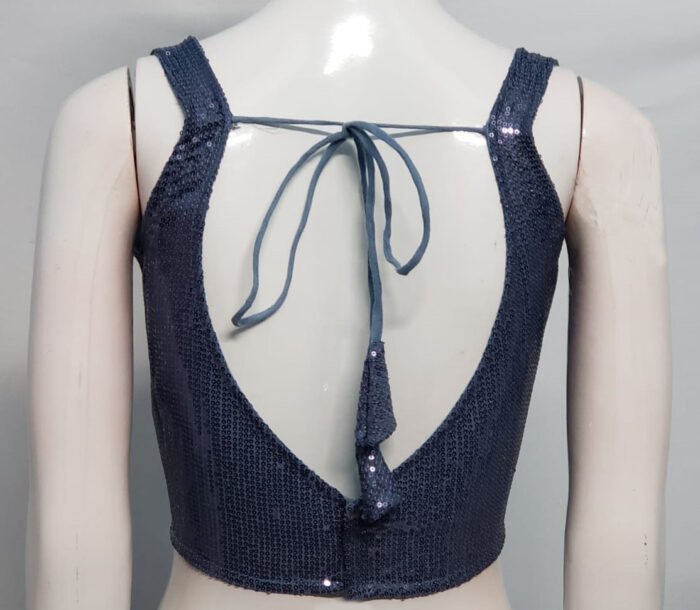 This is a Bluish Gray Color Sequin Blouse. This Blouse is Sweetheart Neckline in Frontside and Curved V-Neckline in Backside with Tie Up. This is a Princess Cut, Padded & Sleeveless Blouse with Back Open. You can team it up with any contrast colored Printed or Traditional Saree.