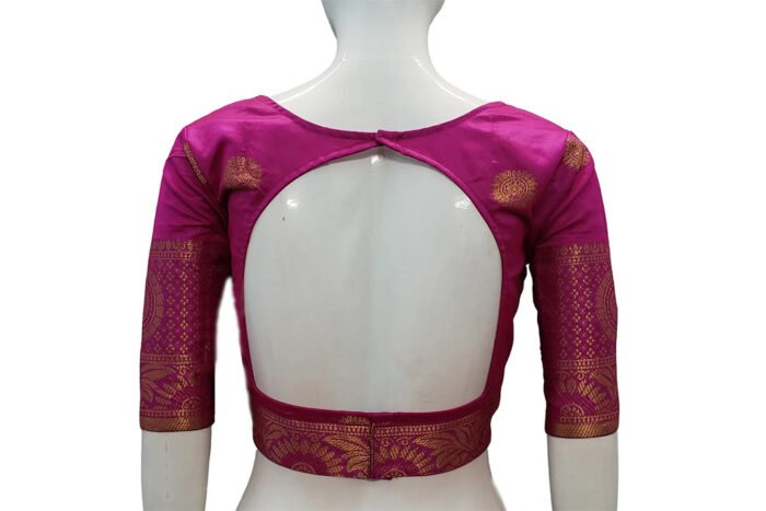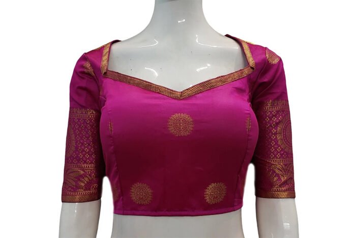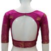 This is a Pink Color Blended Silk Blouse With Antique Golden Zari. This Blouse is Queen Anne Neckline in Frontside and Keyhole Neckline in Backside. This is a Princess Cut, Padded, Glass Sleeve Blouse with Back Open. You can team it up with any contrast colored Printed or Traditional Saree.