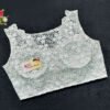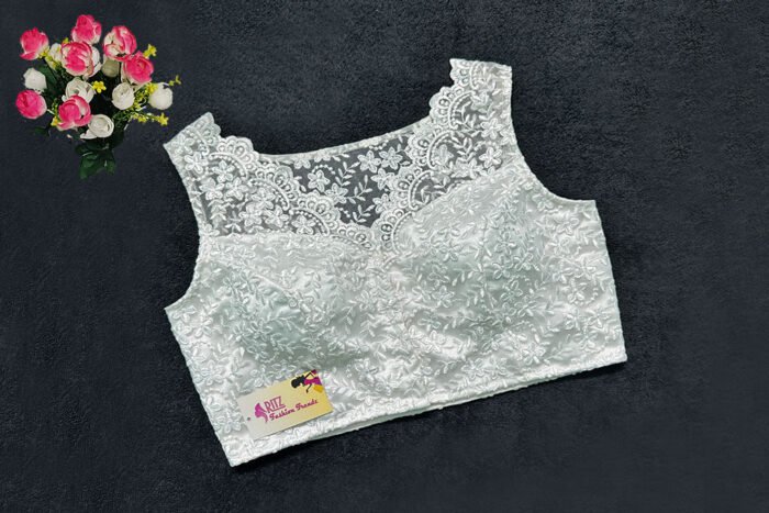 This is a White Color Net Blouse. This is V-Neckline in Frontside & Boat Neckline in Backside. This is a Princess Cut, Padded, Sleeveless Blouse with Front Open. You can team it up with any contrast-colored Traditional/Printed Saree.