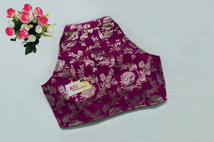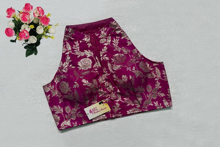 This is a Magenta Color Brocade Blouse. This is Halter Neckline in Frontside & High Neckline in Backside with Mandarin Collar. This is a Princess Cut, Padded, Sleeveless Blouse with Front Open. You can team it up with any contrast-colored Traditional/Printed Saree.