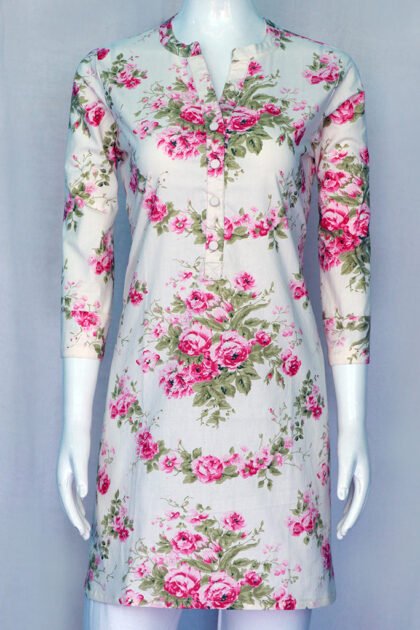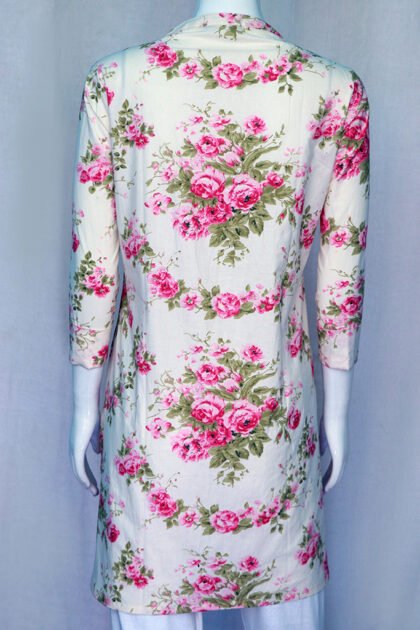 This is a Red Color Jamdani Kurti Set. It is Leaf Neckline in Frontside & High Neckline in Backside with Mandarin Collar. This Kurti is 3/4 Sleeve and Knee Length.