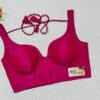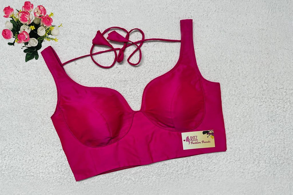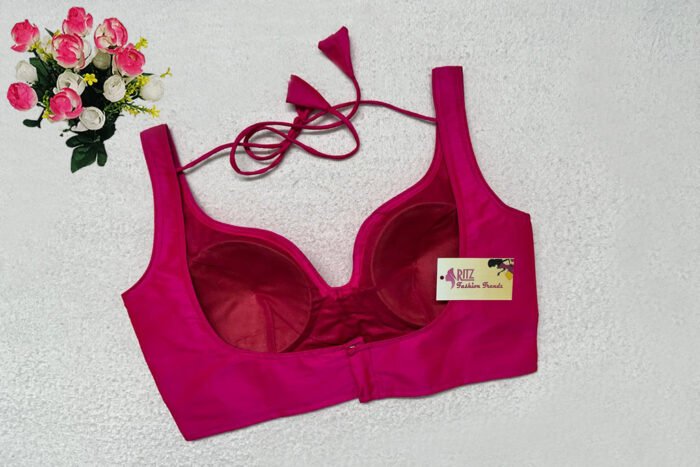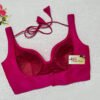This is a Hot Pink Color Samo Silk Blouse. This is Sweetheart Neckline in Frontside & U-Neckline in Backside with Tie-Up. This is a Princess Cut, Padded, Sleeveless Blouse with Back Open. You can team it up with any contrast-colored Traditional/Printed Saree.