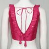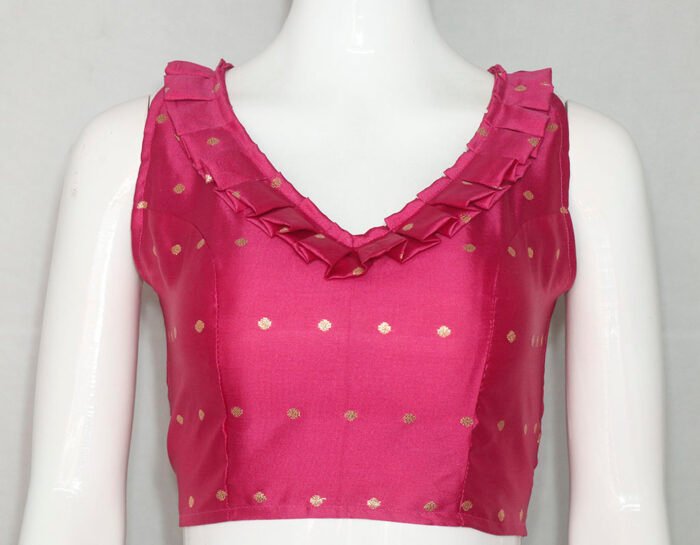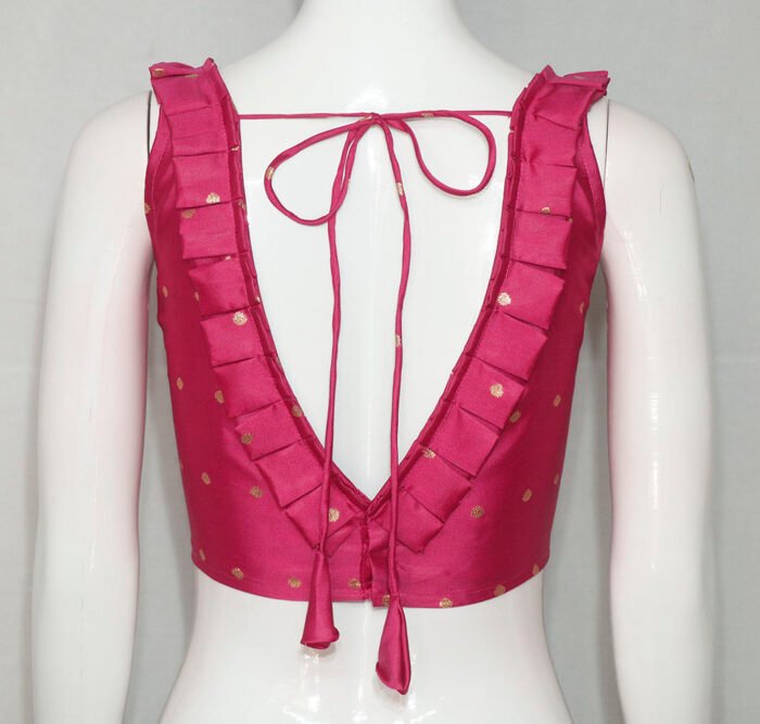 This is a Pink Color Taffeta Silk Blouse. This Blouse is a Sleeveless Blouse with V Neckline in Frontside and Deep V Neckline in Backside with Frill Work. This is a Princess Cut Padded Sleeveless Blouse with Back Open. The Printed Work Enhance the beauty of this blouse. You can team it up with any contrast colored Traditional Saree.