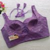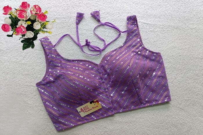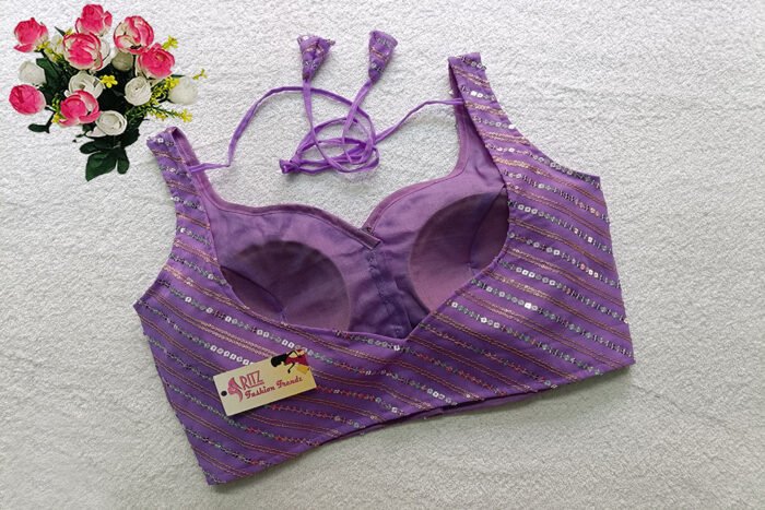This is a Lavender Color Georgette Sequin Blouse. This Blouse is Sweetheart Neckline in Frontside & Backside with Tie-Up. This is a Princess Cut, Padded, Sleeveless Blouse with Front Open. You can team it up with any contrast-colored Traditional/Printed Saree.