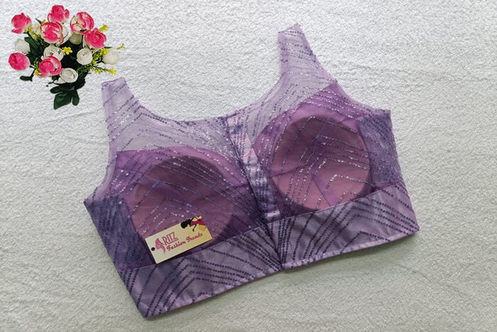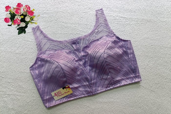 This is a Lavender Color Sequin Net Blouse. This Blouse is Illusion Neckline in Frontside & Backside. This is a Princess Cut, Padded, Sleeveless Blouse with Back Open. You can team it up with any contrast-colored Traditional/Printed Saree.