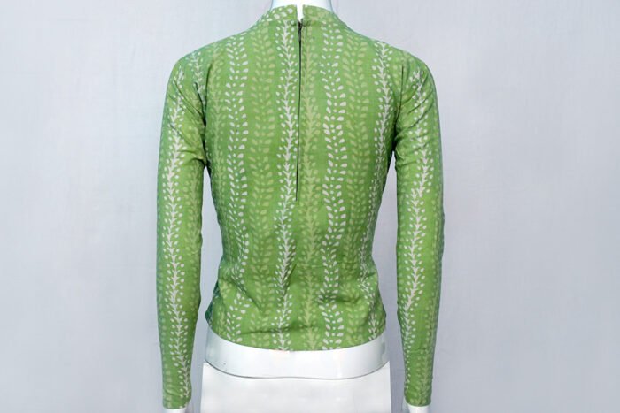 This is a Parrot Green Color Cotton with Contrast Color Natural Leaf Motif Printed Jacket Blouse. It is High Neckline in Both Front and Backside with Mandarin Collar. This Blouse is Long Sleeve and Back Open. You can team it up with any contrast colored saree.