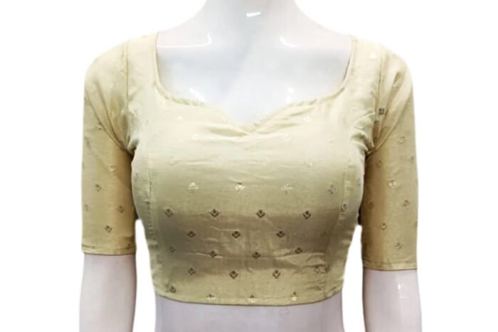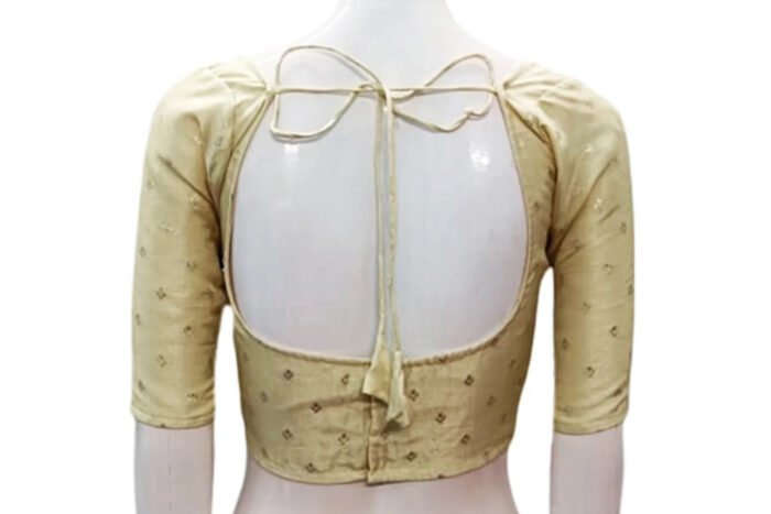 This is a Cream Color Russian Silk Blouse. This Blouse is Sweet-Heart Neckline in Frontside and U-Neckline in Backside with Tie-Up. This is a Princess Cut, Padded, Glass Sleeve Blouse with Back Open. You can team it up with any contrast colored Printed or Traditional Saree.