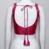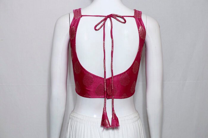 This is a Pink Color Satin Benarasi with Leaf Motif Zari Work Blouse. It is Leaf Neckline in Frontside and Backside with Tie Up. This is a Princess Cut Padded Blouse. This Blouse is Sleeveless and Back Open. You can team it up with any contrast colored Printed or Traditional Saree.