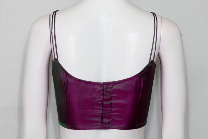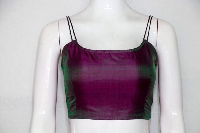 This is a Purple Color Samo Silk Spaghetti. It is a Double Spaghetti Strap with Round Neckline in Frontside and Backside. It is Princess cut and Padded Blouse with Back Open. You can team it up with any contrast color Traditional or Printed Saree.