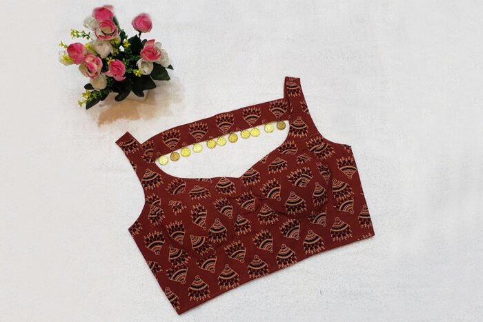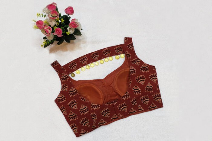 This is a Maroon Color Ajrakh Printed Cotton Blouse. This Blouse is Sweetheart Neckline in Frontside & U-Neckline in Backside with a Band. This is a Princess Cut, Padded, Sleeveless Blouse with Back Open. You can team it up with any contrast-colored Traditional/Printed Saree.