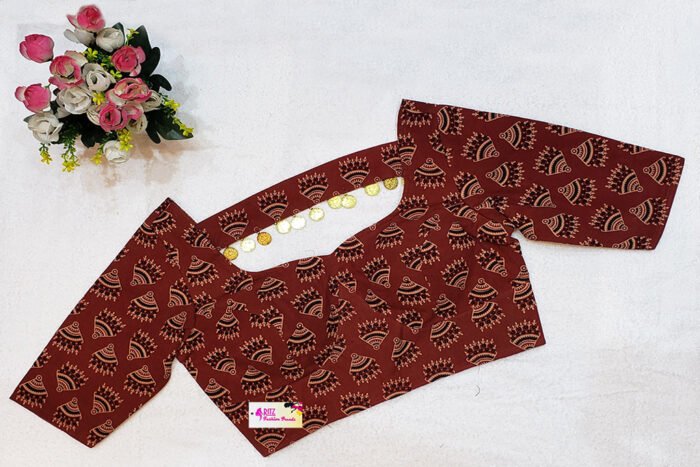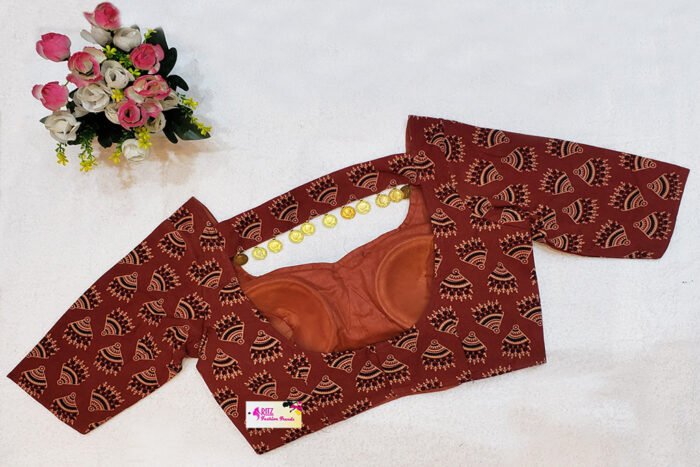 This is a Maroon Color Ajrakh Printed Cotton Blouse. This Blouse is Sweetheart Neckline in Frontside & U-Neckline in Backside with a Band. This is a Princess Cut, Padded, Glass Sleeve Blouse with Back Open. You can team it up with any contrast-colored Traditional/Printed Saree.
