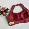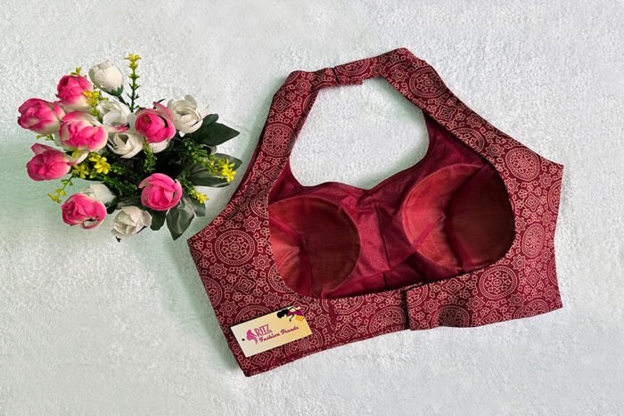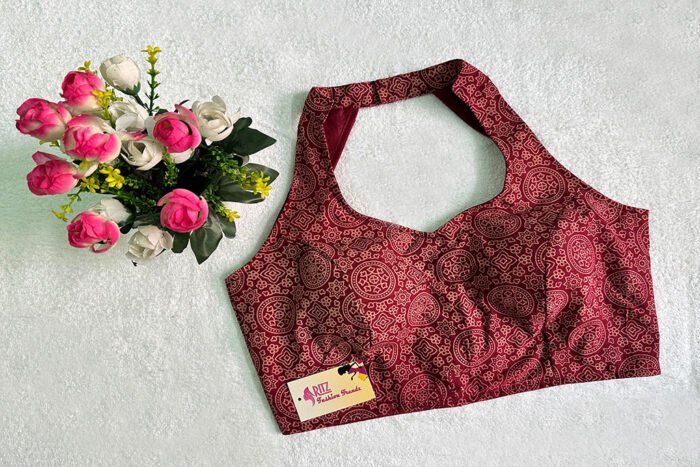 This is a Maroon Color Ajrakh Printed Cotton Blouse. This Blouse is Double Strap Halter Neckline in both Frontside & Backside with Mandarin Collar. This is a Princess Cut, Padded, Sleeveless Blouse with Back Open. You can team it up with any contrast-colored Traditional/Printed Saree.