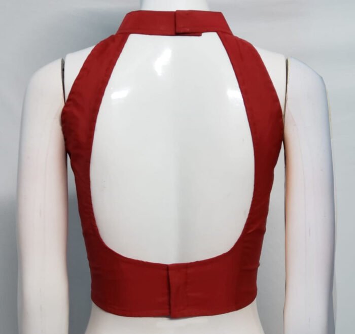 This is a Dark Red Color Samo Silk Blouse. This Blouse is Halter Arrow Neckline in Frontside and Backside with Mandarin Collar. This is a Princess Cut, Padded, Sleeveless Blouse with Back open. You can team it up with any contrast colored Printed or Traditional Saree.