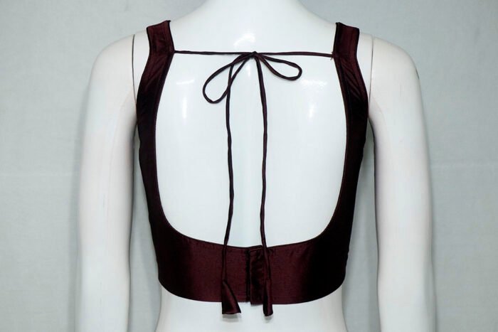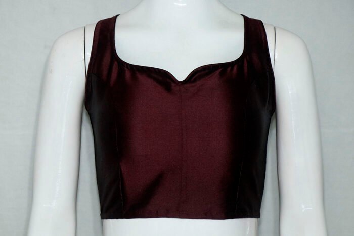 This is a Wine Color Samo Silk Blouse. It is Semi Sweet Heart Neckline in Frontside and Square Neckline in Backside with Tie Up. This is a Princess Cut Padded Blouse. This Blouse is Sleeveless and Back Open. You can team it up with any contrast colored Traditional Saree.