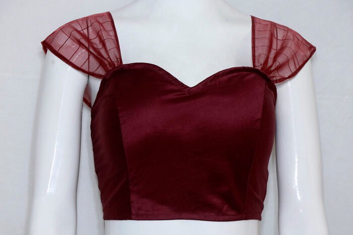 This is a Maroon Color Samo Silk Blouse with Organza Sleeves. It is Sweetheart Neckline in Frontside and Square Neckline in Backside. This is a Princess Cut Padded Blouse. This Blouse is Sleeveless and Back Open. You can team it up with any contrast color Printed/Traditional Saree.