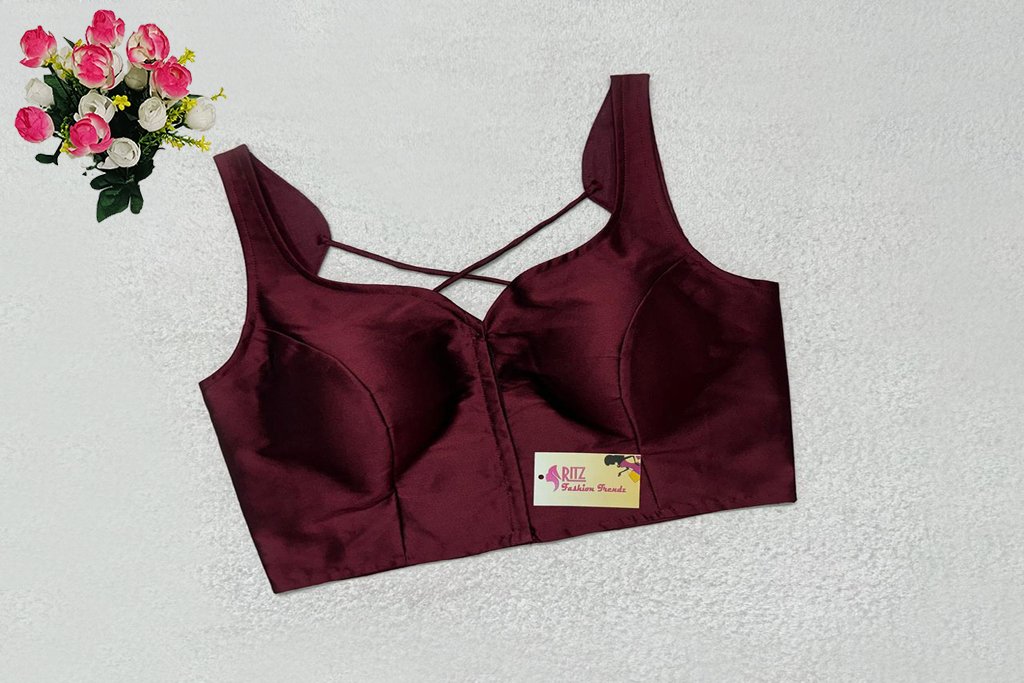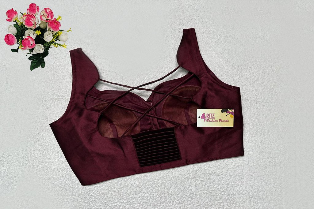 This is a Maroon Color Samo Silk Blouse. This is Sweetheart Neckline in Frontside & Scallop Neckline in Backside with Criss-Cross Tie-Up. This is a Princess Cut, Padded, Sleeveless Blouse with Front Open. You can team it up with any contrast-colored Traditional/Printed Saree.