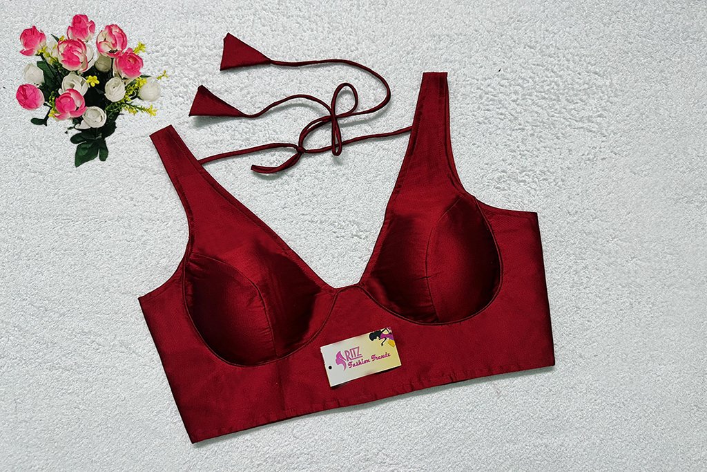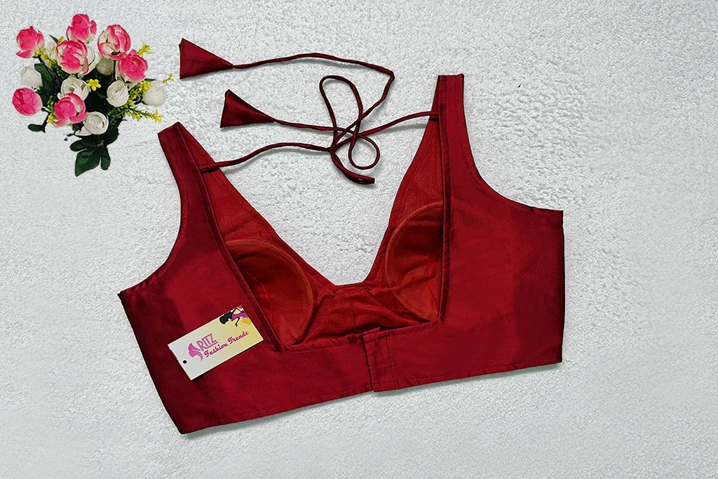 This is a Maroon Color Samo Silk Blouse. This Blouse is V-Neckline in both Frontside & Square Neckline in Backside with Tie-Up. This is a Princess Cut, Padded, Sleeveless Blouse with Back Open. You can team it up with any contrast-colored Traditional/Printed Saree.