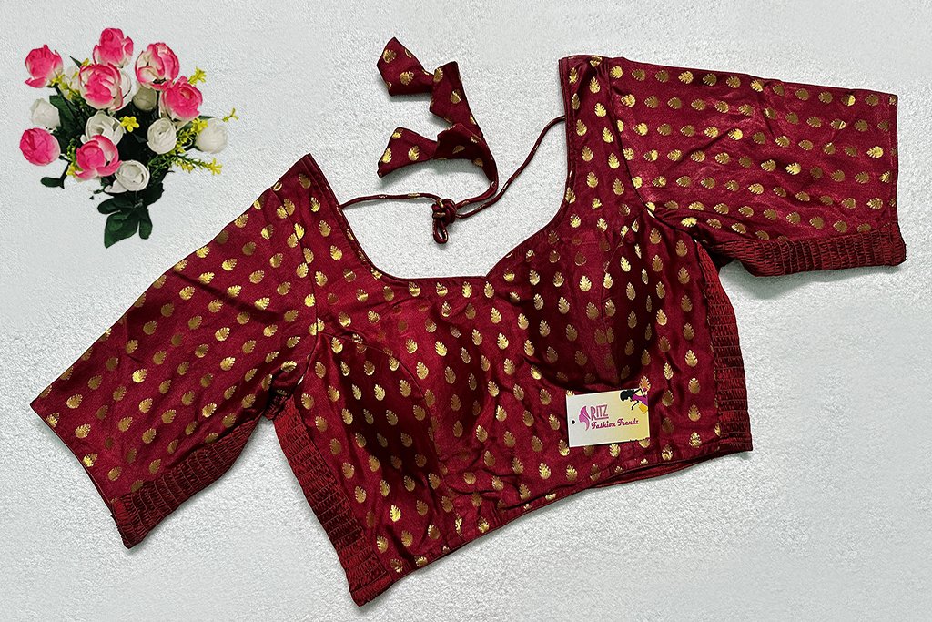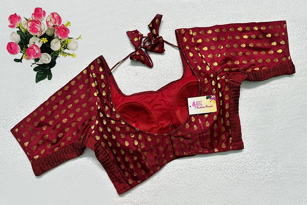 This is a Maroon Color Satin Elastic Ease Blouse. This is Sweetheart Neckline in Frontside & Leaf Neckline in Backside with Tie-Up. This is a Princess Cut, Padded, Glass Sleeve Blouse with Back Open. You can team it up with any contrast-colored Traditional/Printed Saree.