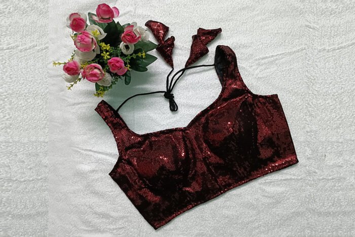 This is a Dark Maroon Color Sequin Blouse. This Blouse is Sweetheart Neckline in Frontside and U-Neckline in Backside with Tie-Up. This is a Princess Cut, Padded, Sleeveless Blouse with Back Open. You can team it up with any contrast colored Printed or Traditional Saree.