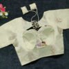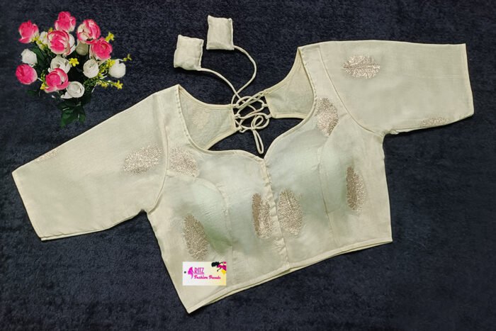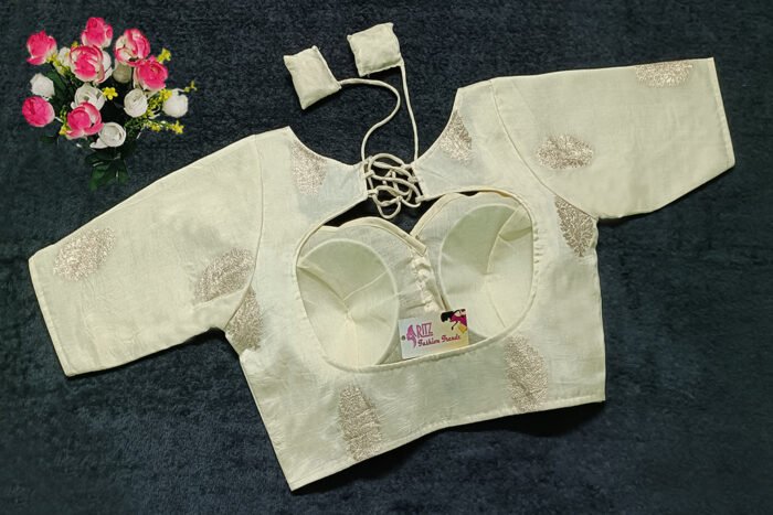 This is a Cream Color Russian Silk Blouse. This Blouse is Sweetheart Neckline in Frontside & Keyhole Neckline in Backside with Tie-Up. This is a Princess Cut, Padded, Glass Sleeve Blouse with Front Open. You can team it up with any contrast-colored Traditional/Printed Saree.